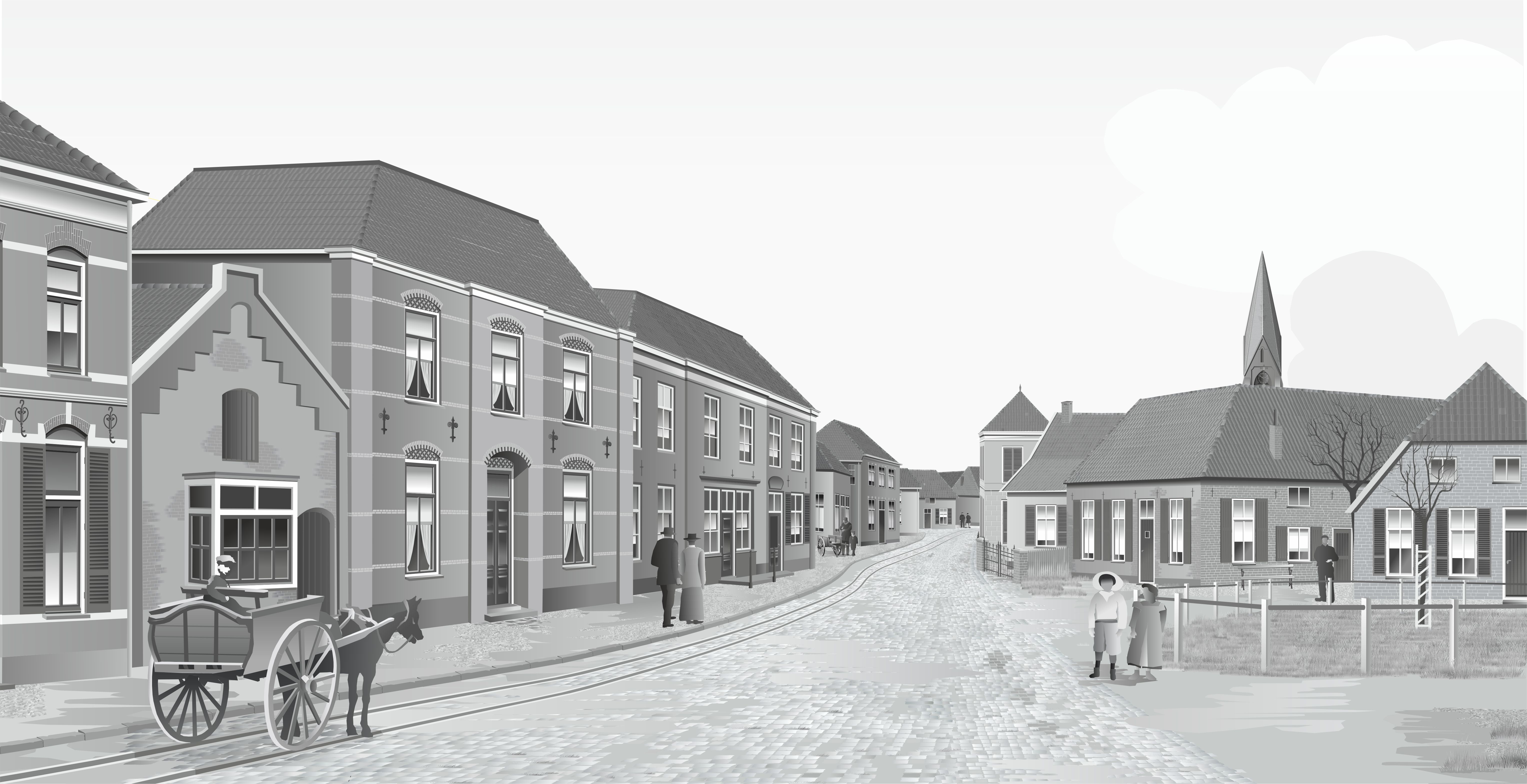 Dorpstraat anno 1910 AI bewerking van tekening