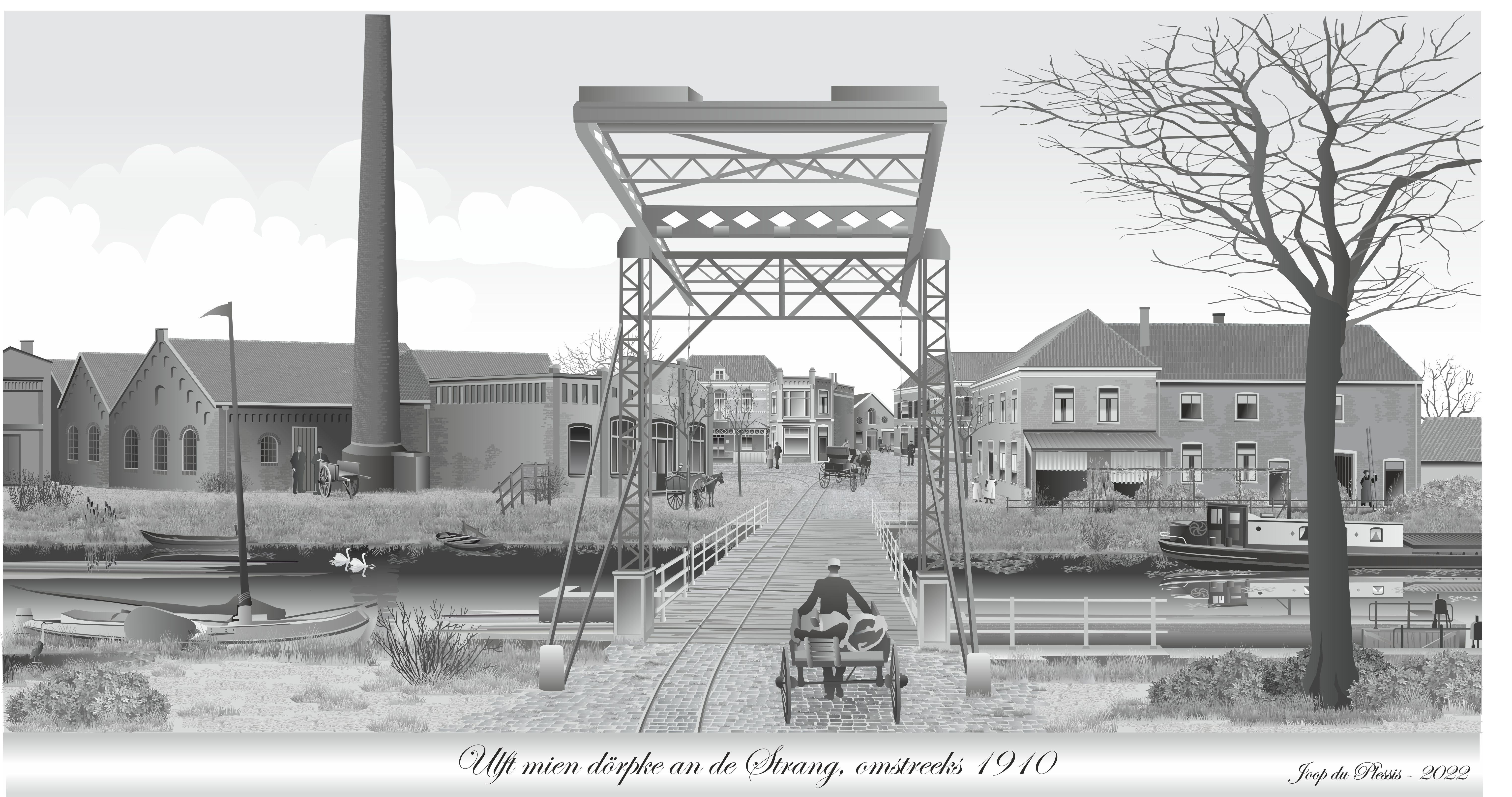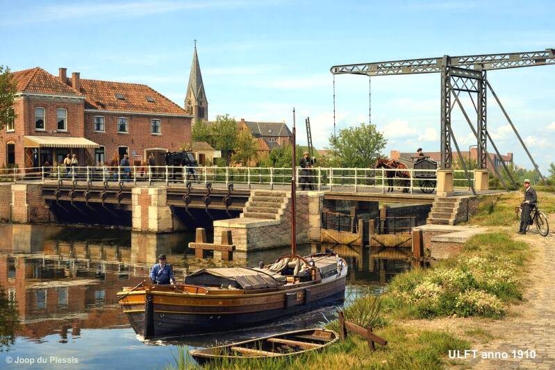 Realistisch beeld van Ulft met schutsluis en de oude brug met zijn metalen ophaal-mechanisme omstreeks 1910, gezien vanaf de Oversluis. Links de bedrijfsgebouwen van Becking & Bongers, rechts Hotel de Sluis die enkele jaren geleden door brand werd verwoest. verdwenen zijn. De gebouwen in de verte bestaan nog.