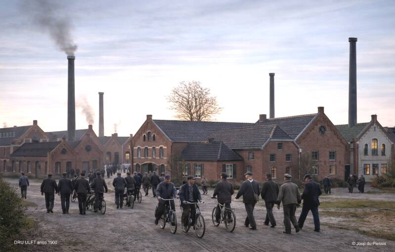 Realistische tekening van de DRU anno 1900 met directievilla `Zeno`. In 1902 en 1905 zouden voor het bestaande gedeelte van de DRU, twee nieuwe grote bedrijfspanden worden gebouwd.
